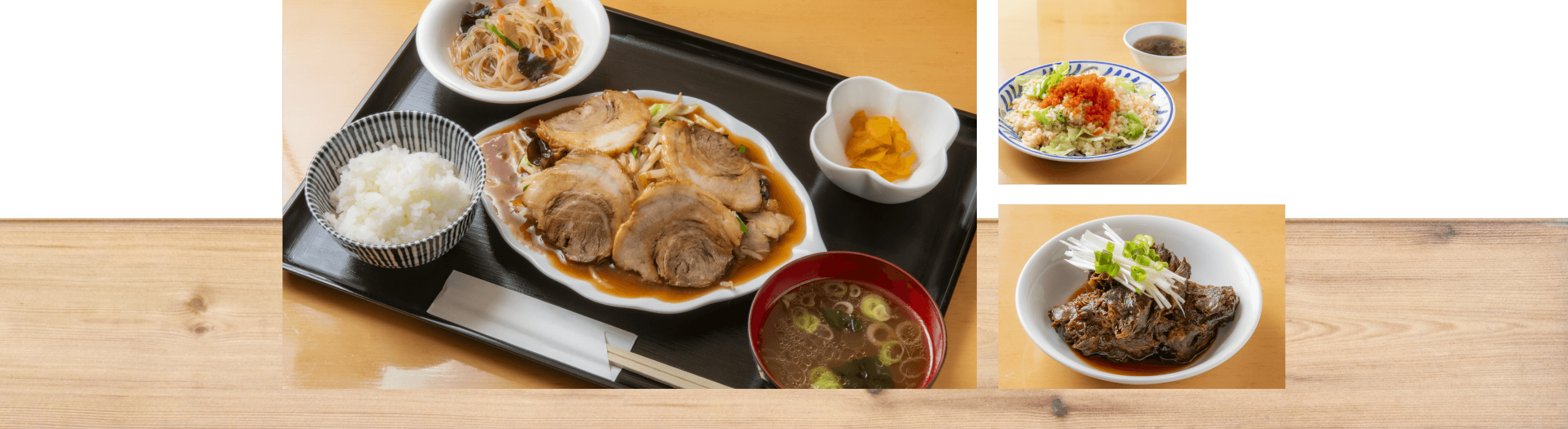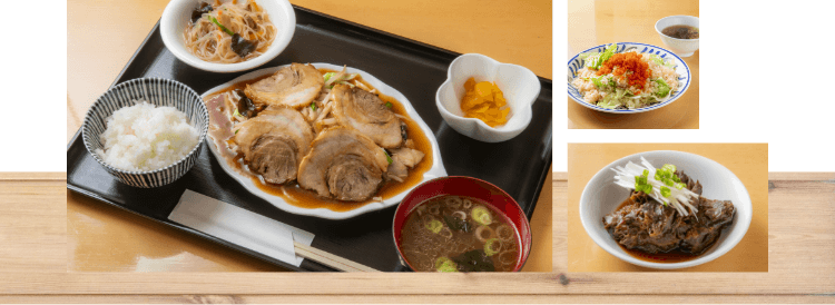 | 野菜炒め定食 (野菜炒め、特製チャーシュー、 スープ、御飯、サラダ、漬物) | 1,100円 |