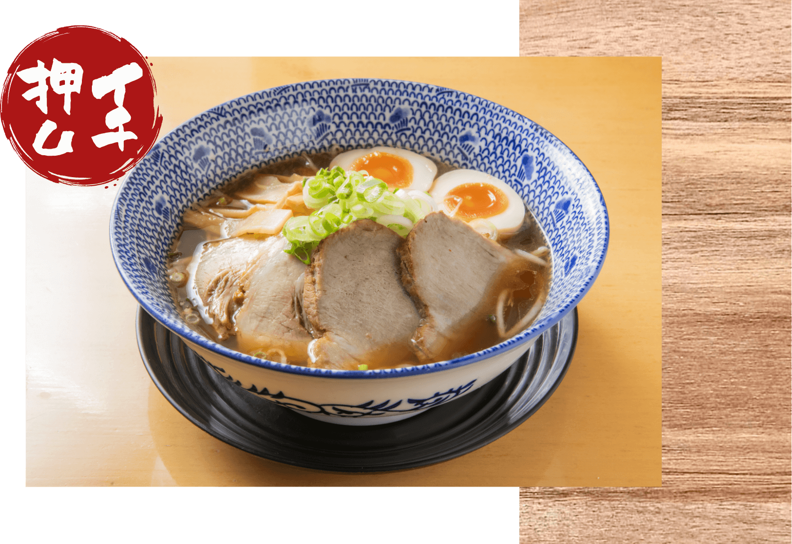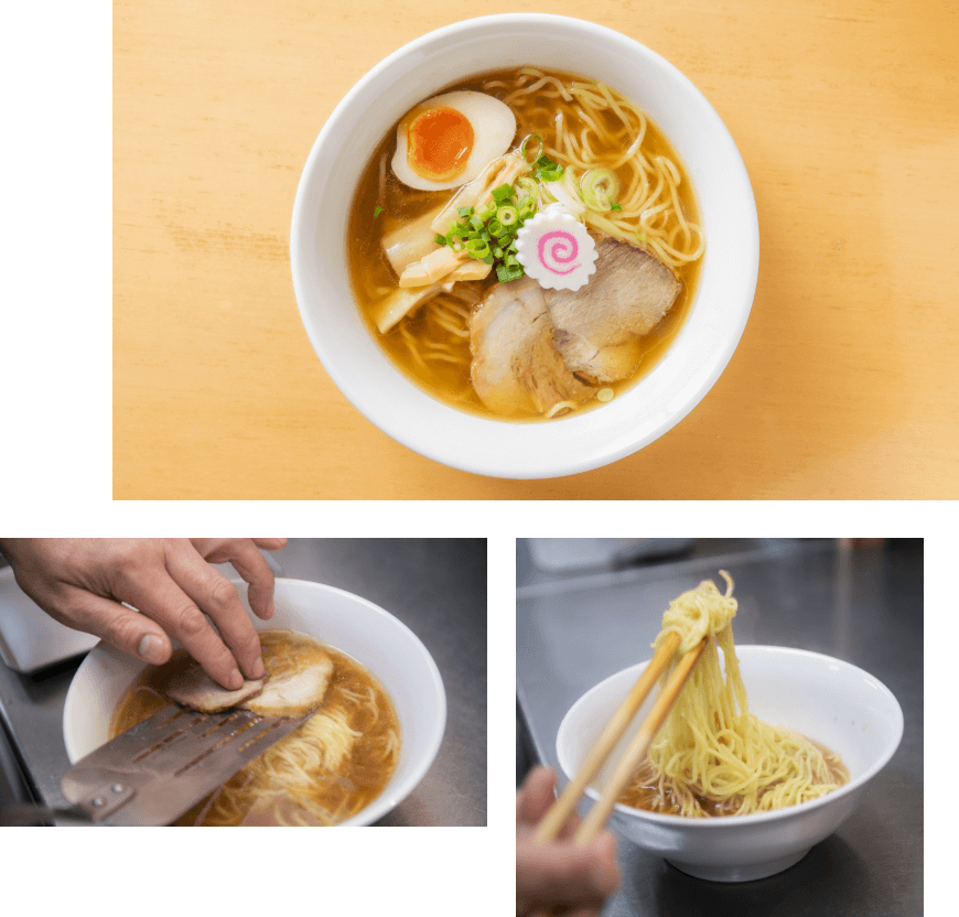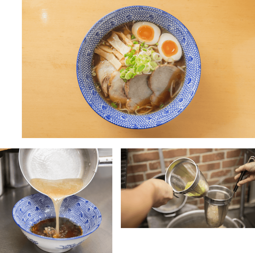 鶏がらと豚のスープに昆布とブレンドした魚介の出汁を合わせ、かえしには濃口醤油とニンニクを用いて、癖の無いスープにしあげました。