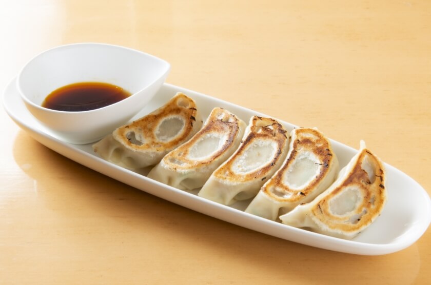 肉、キャベツ、ニラに調味料を加え大判の皮で包み、焼き立ては肉汁がたっぷりで食べ応えのある餃子。